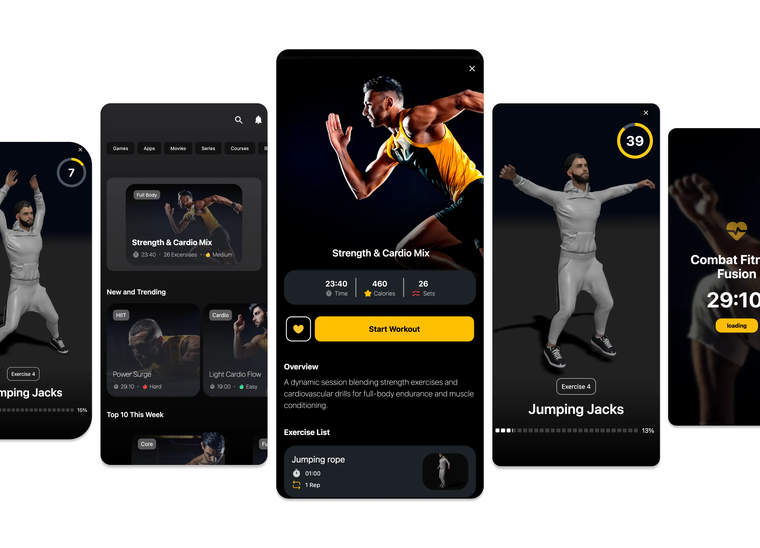 Browse all available workouts, including full-body routines, quick sessions, and goal-based programs, all designed for home training using 3D guidance.